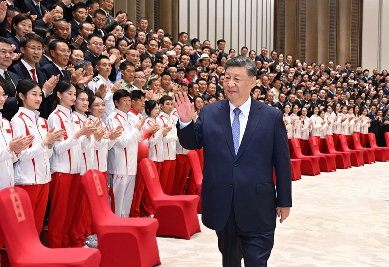 11月9日下午,中共中央总书记、国家主席、中央军委主席习近平在广州亲切接见全国群众体育先进单位、先进个人代表和全国体育系统先进集体、先进个人代表。这是习近平向大家挥手致意。(新华社记者 谢环驰/摄)